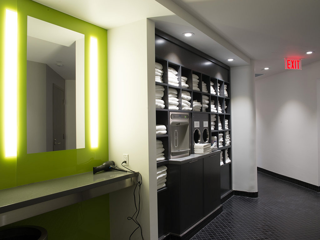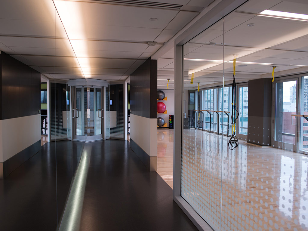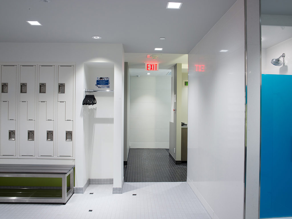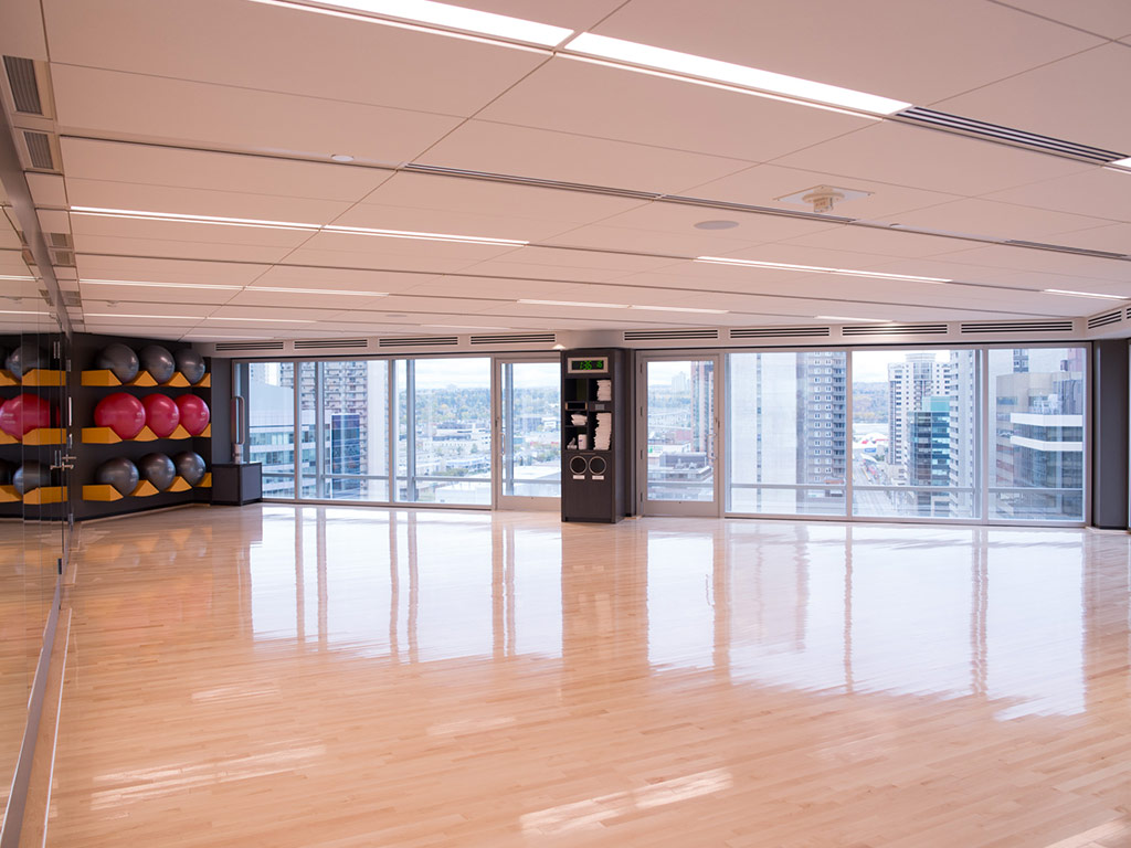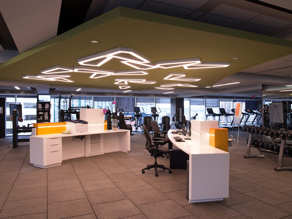 Nexen Wellness Centre supports the health and well-being of its members through creating an environment that promotes personal success, and providing innovative health and wellness programs. The challenge was to use energy efficient luminaires and controls while maintaining the maintenance and budget criteria — both were met. Angular surface LED custom luminaires were designed as artwork of angular metals and opal acrylic with remote drivers.